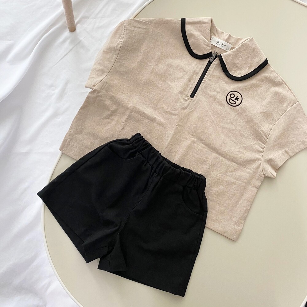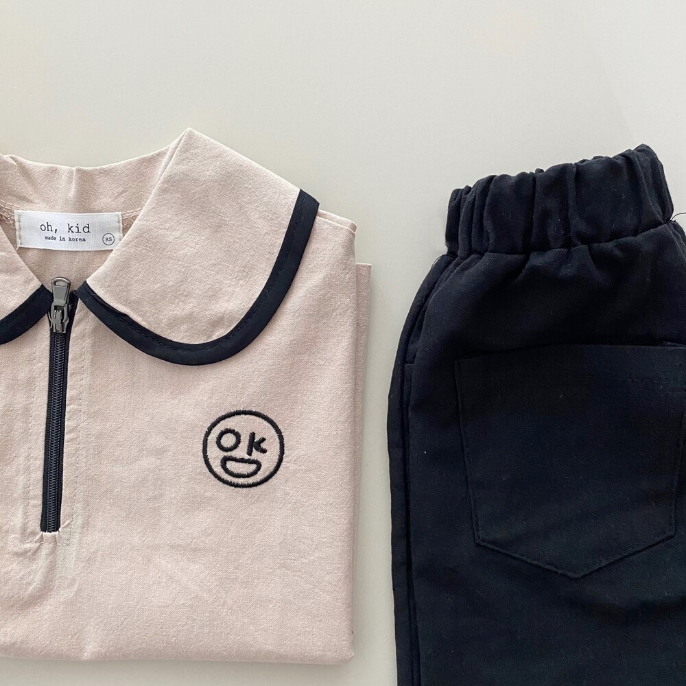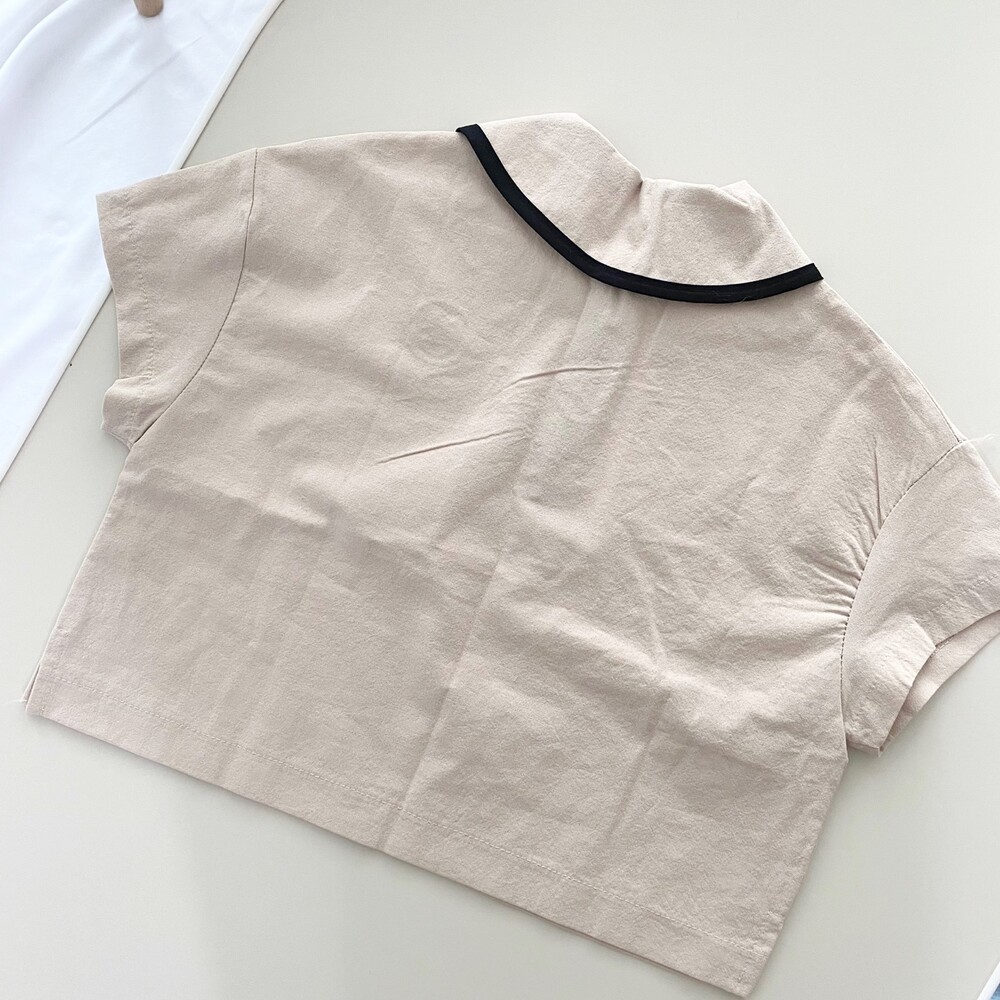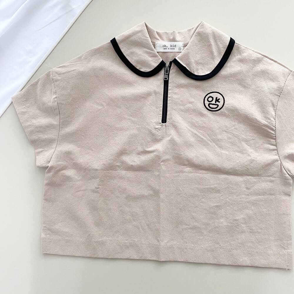 라운딩 카라의 검정색 라인과 반집업이 포인트인 자수카라남방이에요